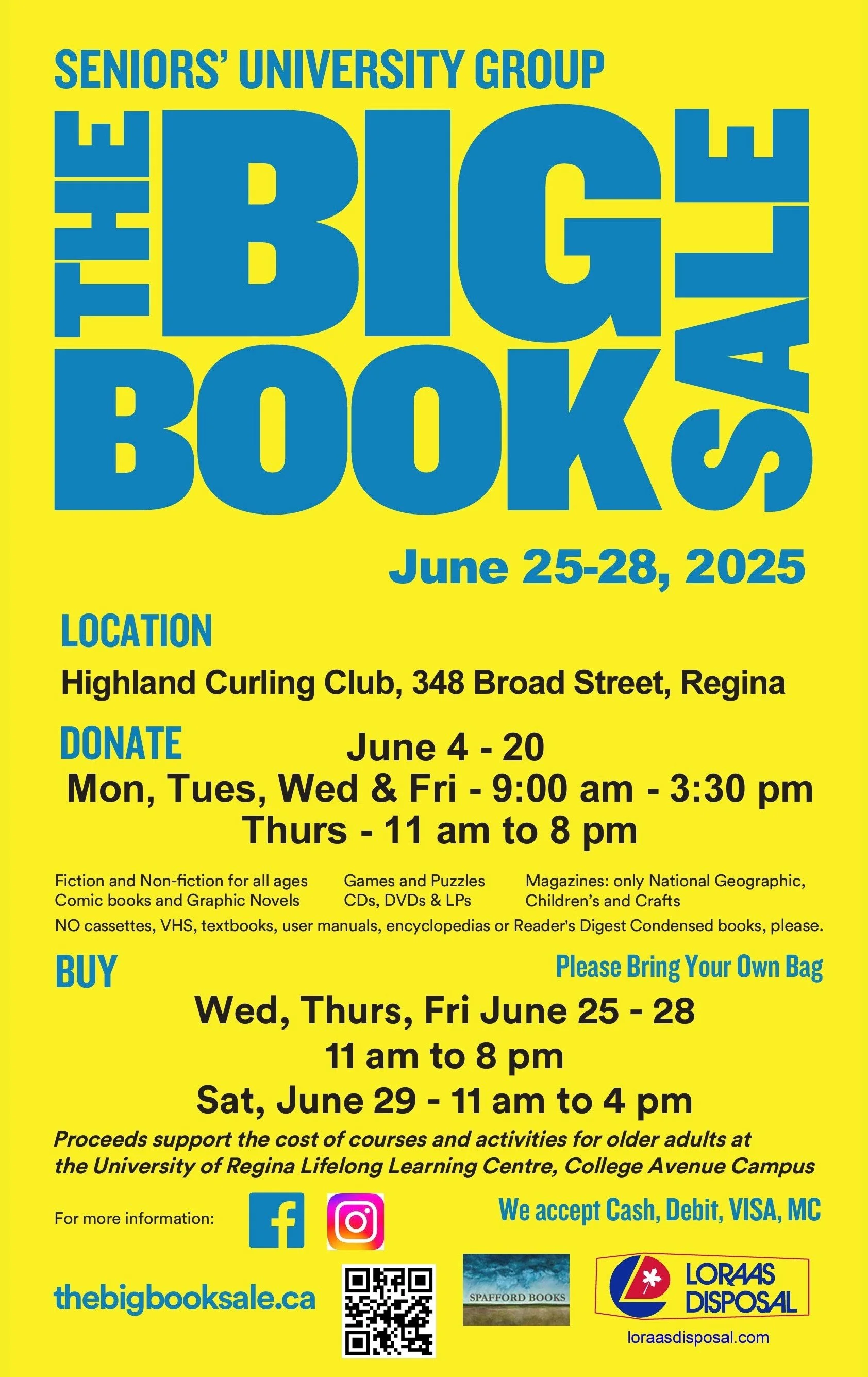 The Big Book Sale is sponsored by the Seniors' University Group and supports classes and activities for older adults at the University of Regina’s College Avenue Campus.